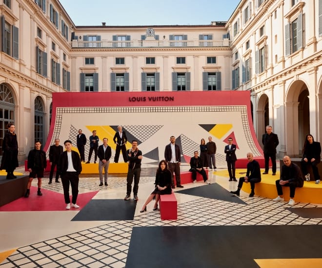 The exhibition extends beyond the interiors into the courtyard, where a large-scale installation — developed in collaboration with the Accademia di Belle Arti di Brera — translates Legrain’s graphic language into a monumental, site-specific work. Alongside the main presentation, Louis Vuitton’s boutique on Via Montenapoleone showcases a series of trunks that underline the house’s technical heritage. These include the Malle Courrier Lozine Maison de Famille, crafted in stained glass and inspired by the Art Nouveau details of the family home in Asnières, as well as the Malle Paravent and the Malle Lit — the latter a contemporary reinterpretation of a travel bed first conceived in the 19th century. Across both locations, the exhibition underscores how Louis Vuitton’s identity is defined by a constant dialogue between past and present, with historical references serving as a foundation for ongoing experimentation.